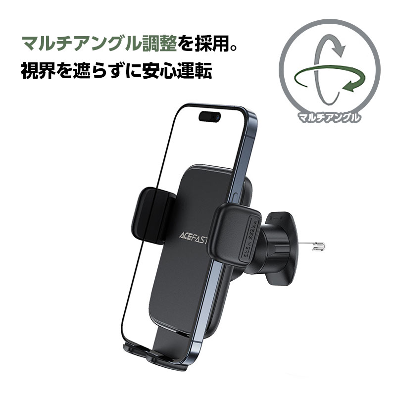 | しっかりとした固定力と、快適な操作性を兼ね備えた車載ホルダー。3軸連動構造により4.5~6.7インチのスマートフォンを安定して保持し、走行中も安心してご使用いただけます。片手で簡単に着脱できる設計で、日常使いにもストレスなくお使いいただけます。360度回転機能により、お好みの角度に調整でき、幅広いスマートフォンに対応しています。 | |