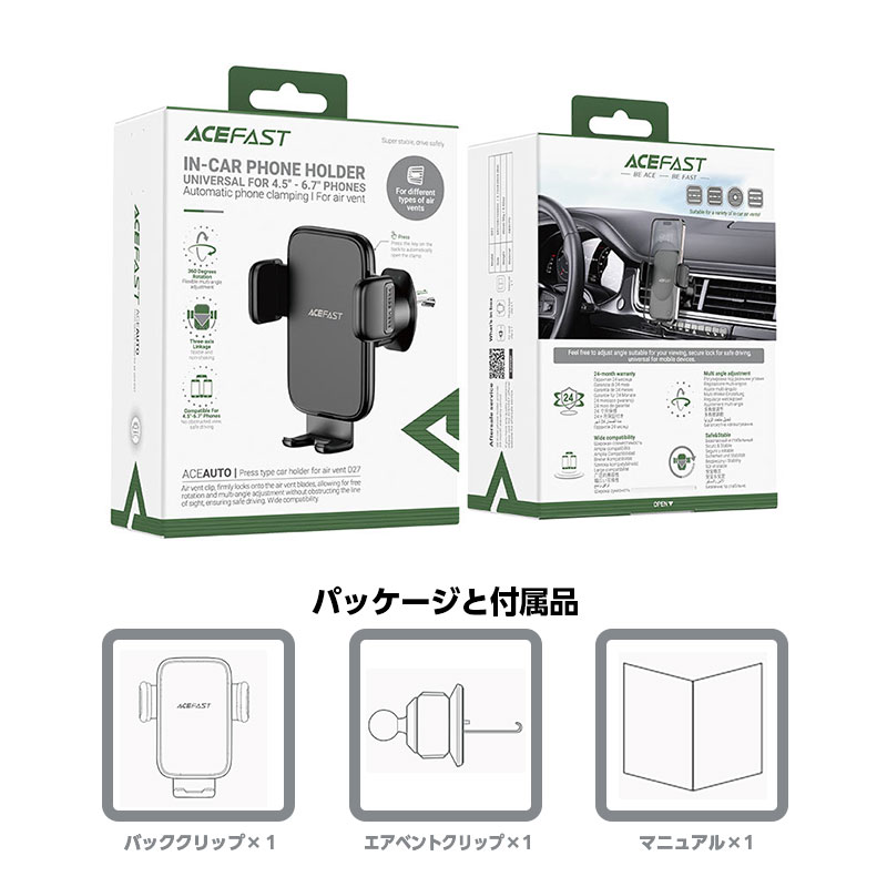 | 箱の中身 | バッククリップ(本体ホルダー)×1、エアベントクリップ×1、マニュアル×1 |