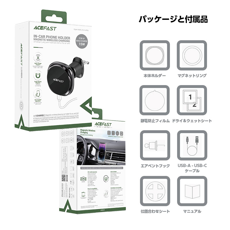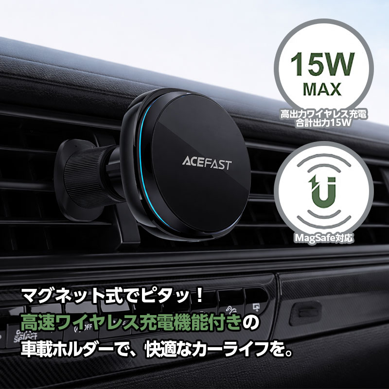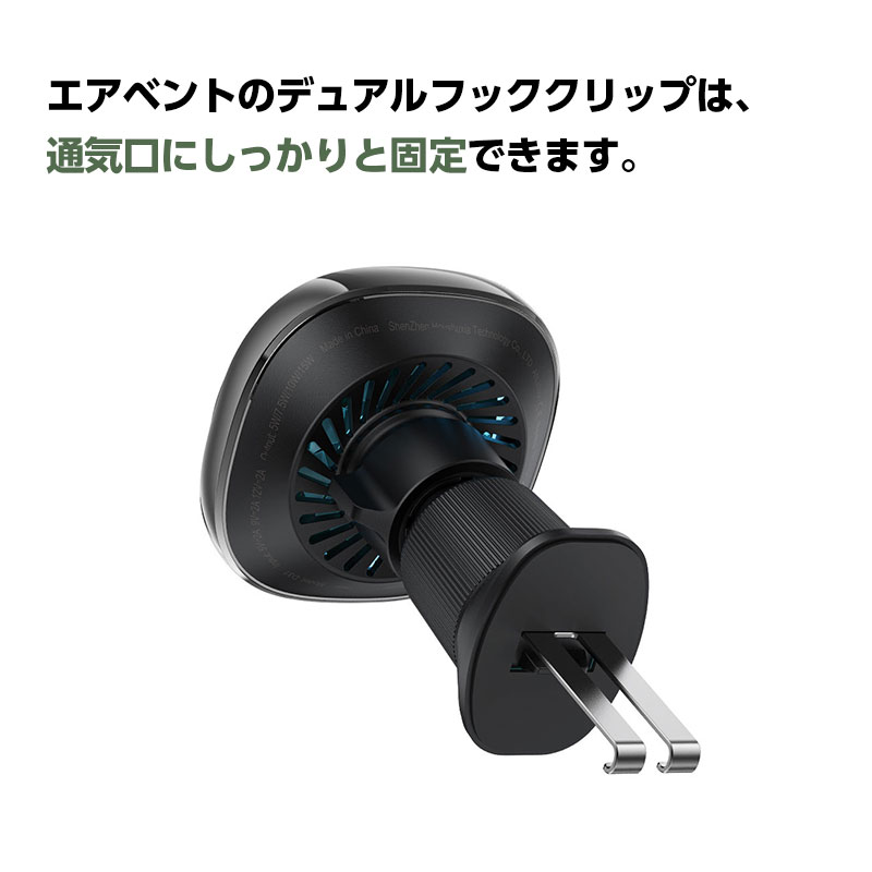 | マグネットで置くだけ装着、最大15Wの急速充電に対応した車載ワイヤレスホルダー。強力磁力で走行中も安定し、ズレや落下を防止します。デュアルフック構造でしっかり固定でき、縦横の角度調整も自由自在。MagSafe対応に加え、付属リングで幅広いスマホにも使える高い互換性を備えた、使いやすさと安定性を両立したモデルです。 | |