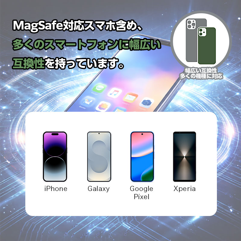 スマートフォン(Qi対応):Qiワイヤレス充電対応スマートフォン MagSafe対応 iPhone:iPhone 15 / 15 Plus / 15 Pro / 15 Pro Max / iPhone 14 / 14 Plus / 14 Pro / 14 Pro Max / iPhone 13 シリーズ / iPhone 12 シリーズ(※MagSafeによりマグネット吸着充電が可能) MagSafe非対応機種:Qi対応Androidスマートフォン(※付属のメタルリング使用で吸着可能) |