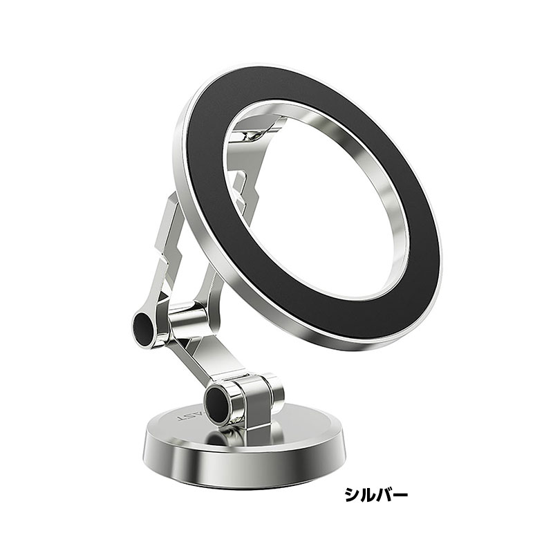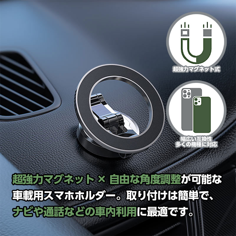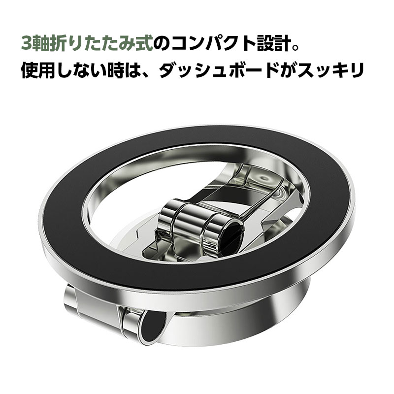 | 「ピタッと固定、スッと操作。」強力マグネットでスマートフォンをしっかり固定し、走行中でも安定して使用できます。3軸折りたたみ構造(多関節アーム)+360°回転ベースで、ナビや通話に最適な角度に自由調整。ダッシュボードにしっかり固定できる3M粘着を採用し、跡が残りにくい設計です。幅広いスマートフォンに対応し、快適で安全なドライブをサポートします。 | |