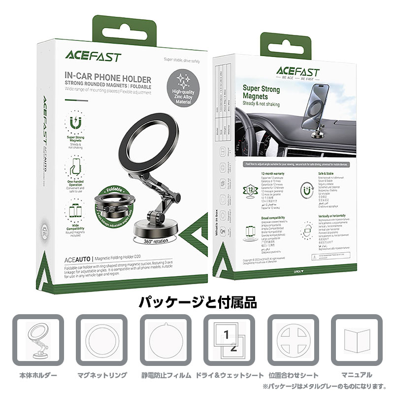 | 箱の中身 | 本体ホルダー×1、マグネットリング×1、静電防止フィルム×1、ドライ・ウェットティッシュ×1、位置合わせシート×1、マニュアル×1 |