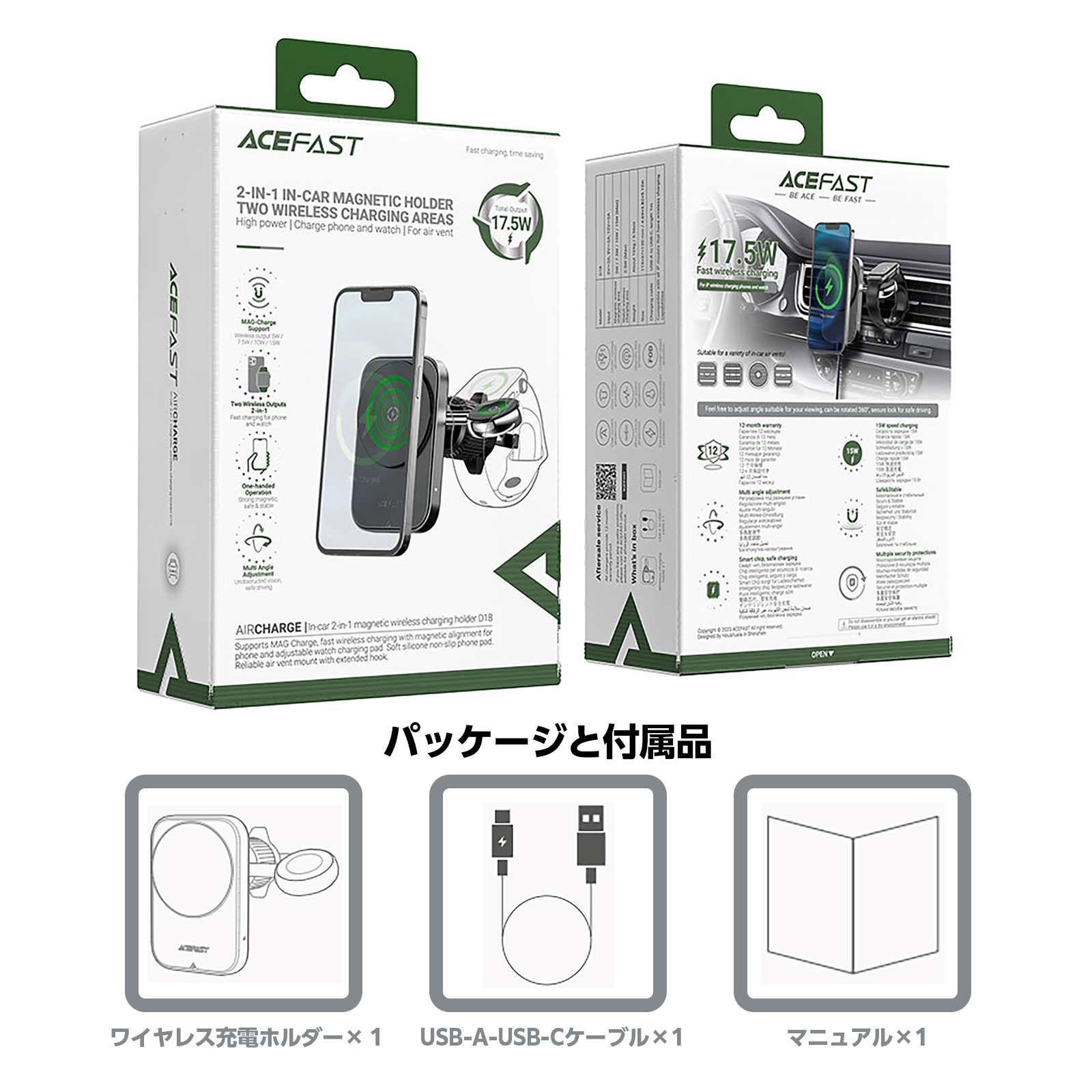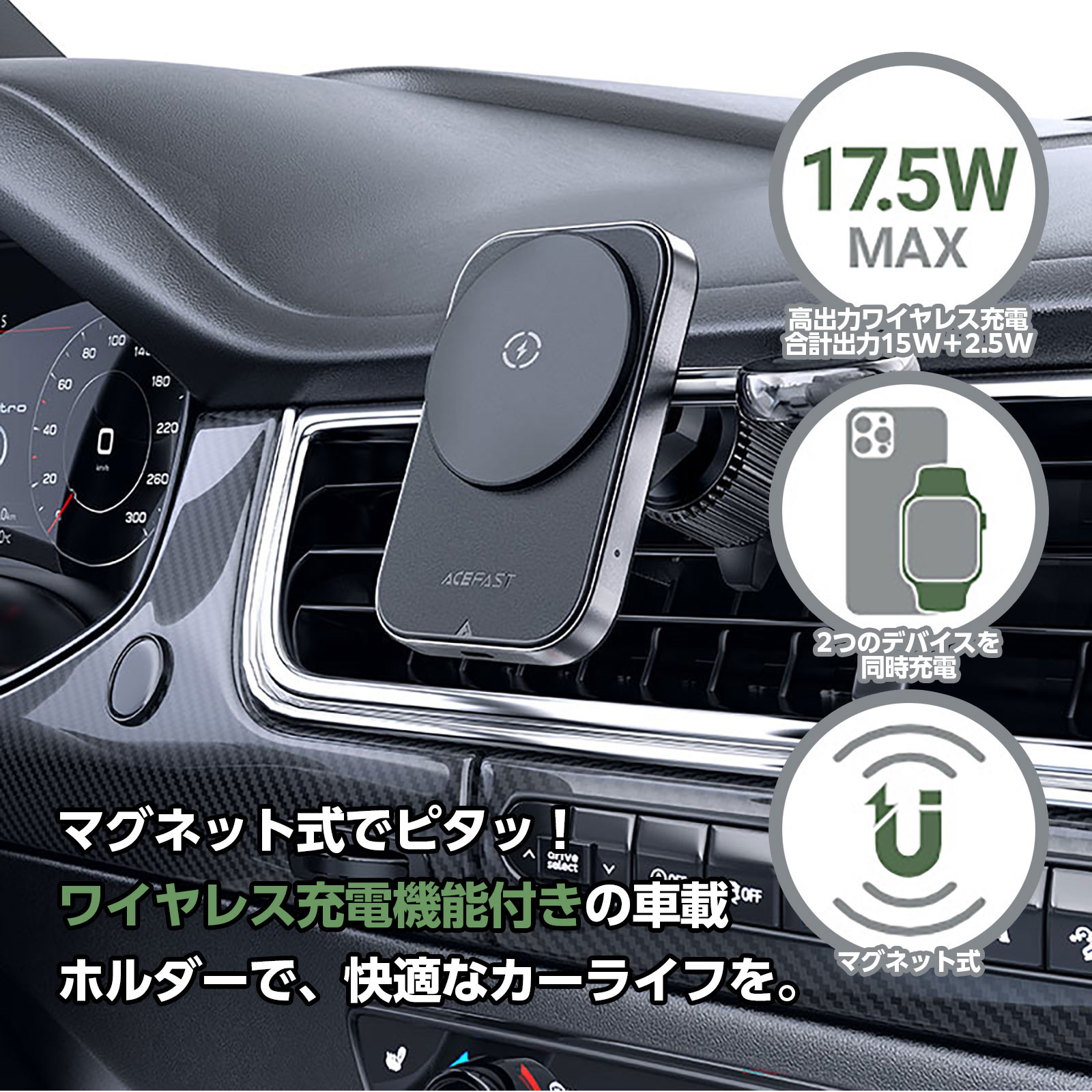| スマートフォンとApple Watchを同時に充電できる、2in1マグネット式ワイヤレス車載ホルダー。最大15Wの急速充電に対応し、MagSafe対応機種を置くだけでしっかり固定&充電が可能です。強力マグネットとエアコン吹き出し口固定クリップで、走行中も安定したホールド力を実現。360°角度調整により、ナビ使用時も快適な視認性をキープします。 | |