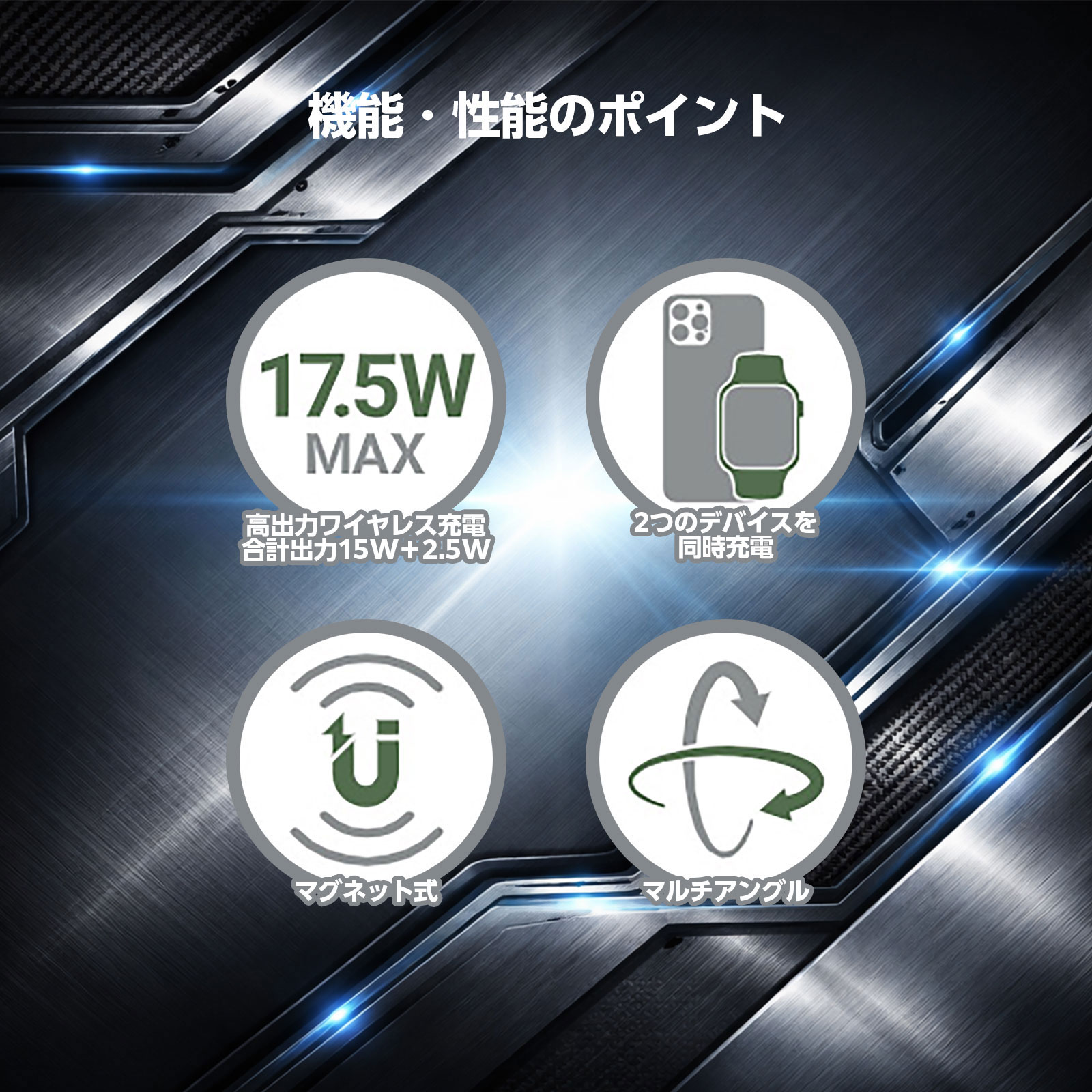 ・本製品はワイヤレス充電対応機器専用です。 ・充電の際は、スマートフォンと本製品の間に金属製の物(リング・カード等)を挟まないでください。 ・磁気吸着部に異物(砂・金属片など)が付着していないことをご確認ください。 ・高温多湿の場所や直射日光の当たる場所での使用・保管はお避けください。 ・分解・改造は行わないでください。 ・Apple Watch 充電時は、対応モデルをご確認の上ご使用ください。 ・ケースの材質や厚みによっては正常に充電できない場合があります。 |