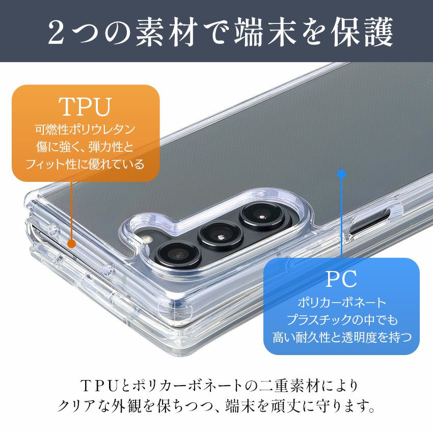 ◆ TPU(可燃性ポリウレタン)とPC(ポリカーボネート)の二重素材により、クリアな外観を保ちつつ端末を頑丈に保護。