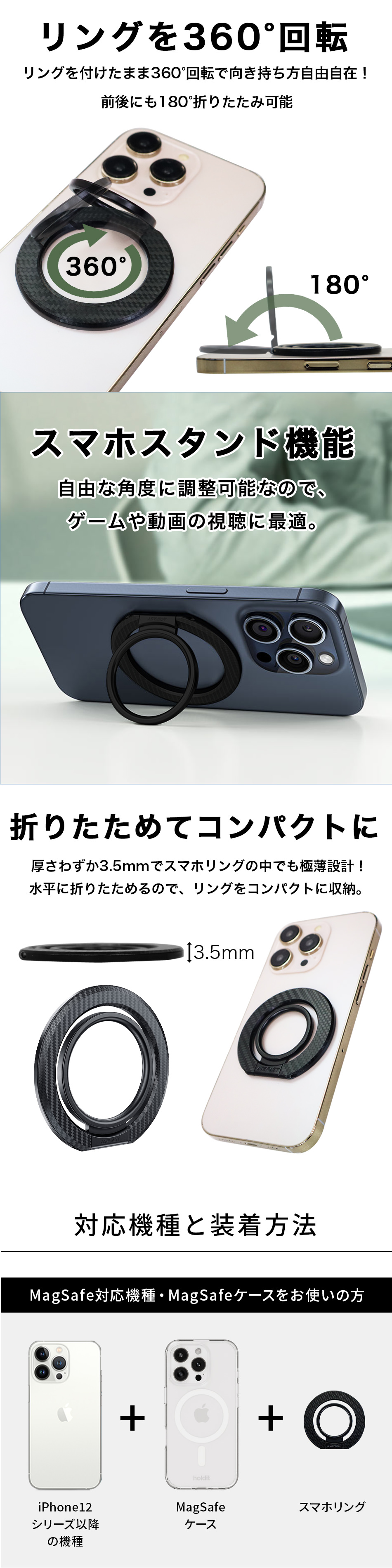 リングを付けたまま360°回転で向き持ち方自由自在!前後にも180°折り畳み可能。
